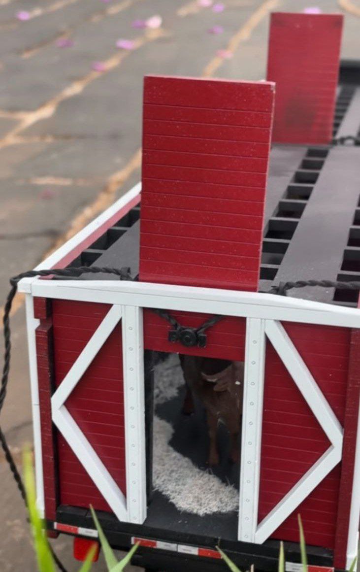 Carreta graneleira: Estrutura em vermelho com detalhes em branco e teto preto vazado