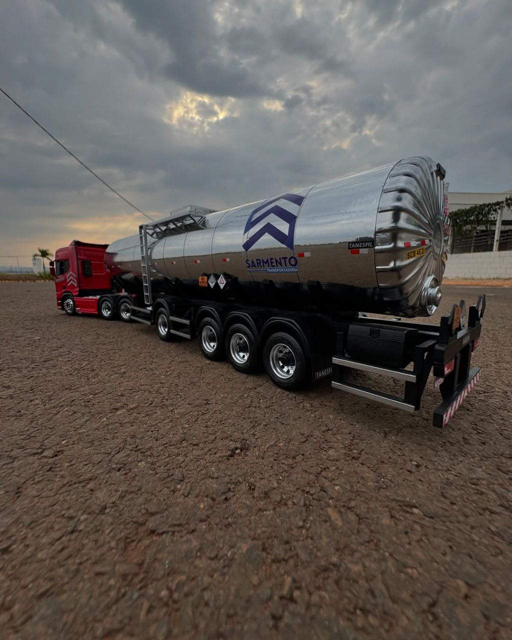 Carreta tanque 4 eixos com pintura metálica e texturização que imita os modelos de transporte de líquidos e combustíveis.
